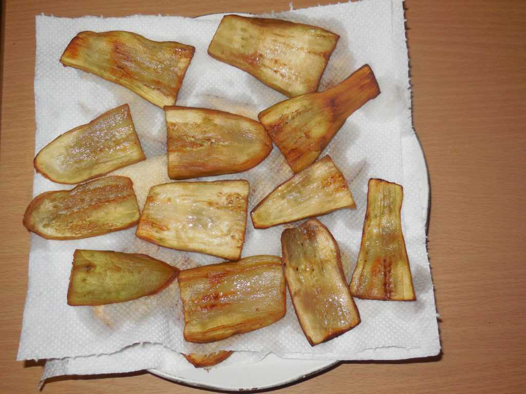 Удалив у баклажанов плодоножки и края, обмываем овощи. Нарезаем их продольными пластинами, шириною в полсантиметра. Раскладываем по застеленному пергаментом противню и на 10 минут отправляем в прогретую духовку.