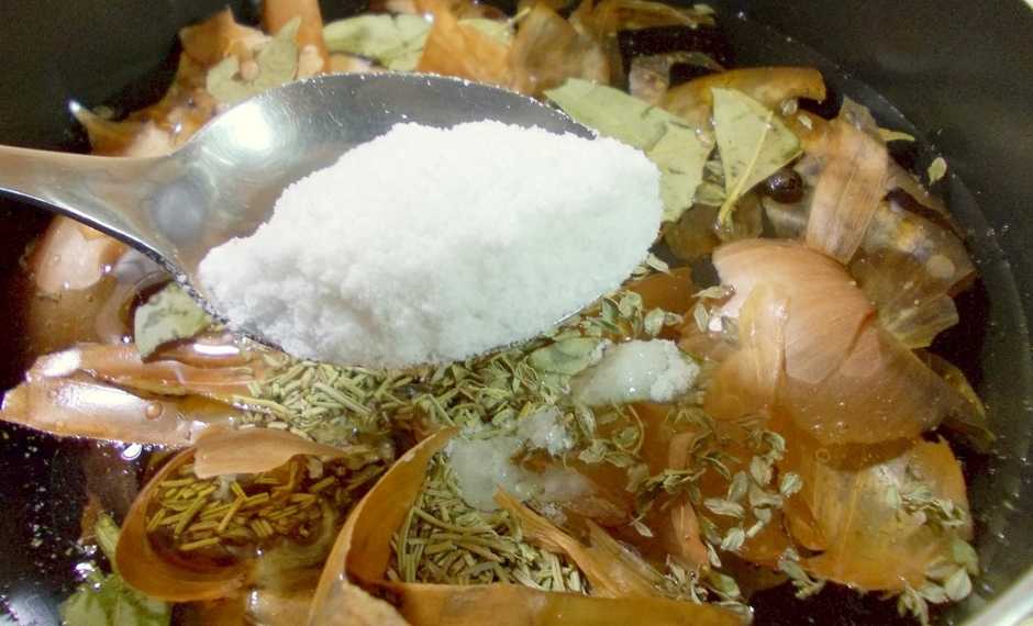 Луковую шелуху нужно тщательно промыть под проточной водой, чтобы отмылась вся грязь, земля и выложить ее в кастрюлю. Заливаем шелуху чистой водой и отправляем туда же все специи и соль.