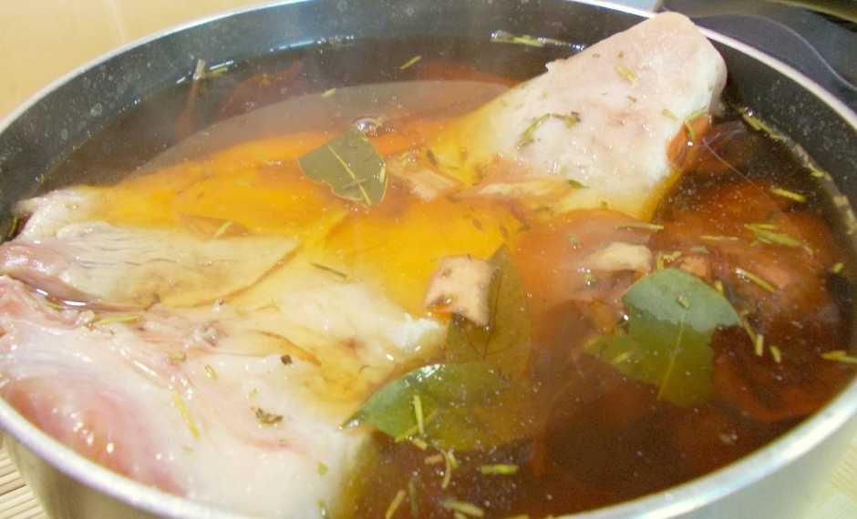 5. В кипящий отвар опустить очищенные щечки и поварить их примерно 40 минут, в процессе добавляя лавровые листы.