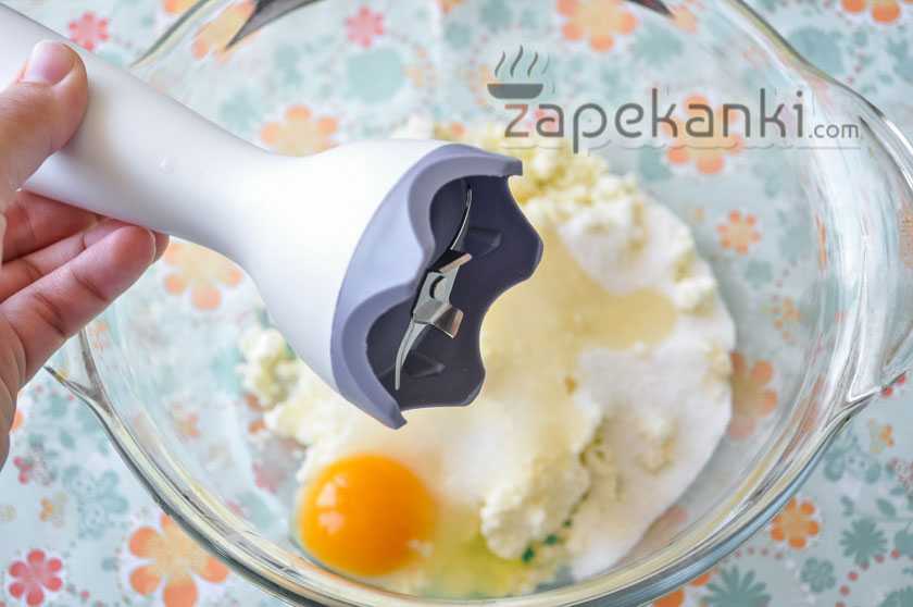 - Далее необходимо добавить творог и вновь взбить продукты миксером.