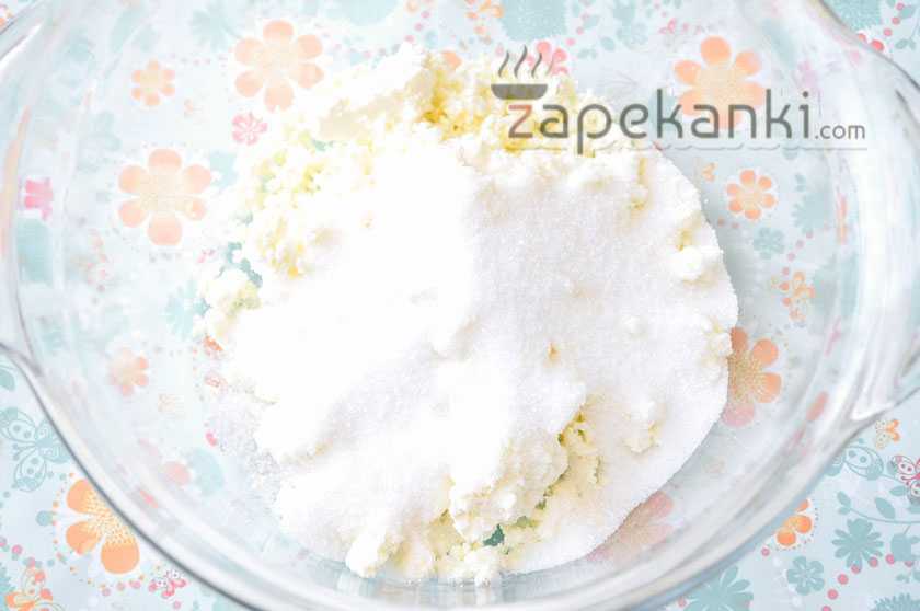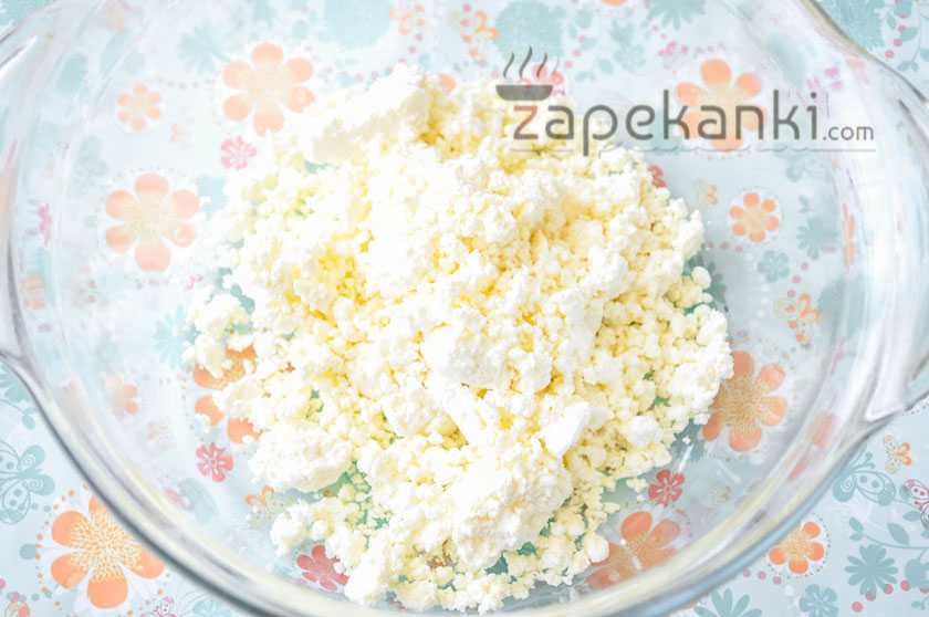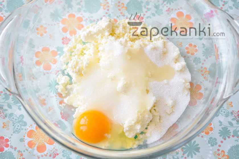 1. в глубокую миску насыпьте творог и разбейте яйца. Совет: чтобы запеканка получилась нежной и воздушной, лучше использовать для ее приготовления мягкий творог. Сухой творог с крупинками, и они будут чувствоваться в готовой запеканке. Однако на вкус она хуже не станет.