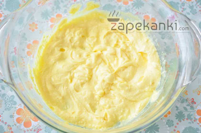 - добавляем творог, взбитые с сахаром яйца и сметану;