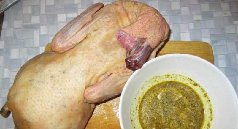 В этом рецепте тушку предварительно не выдерживают в специях, но, чтобы не сомневаться в готовности мяса, лучше утку замариновать, а затем выпекать.