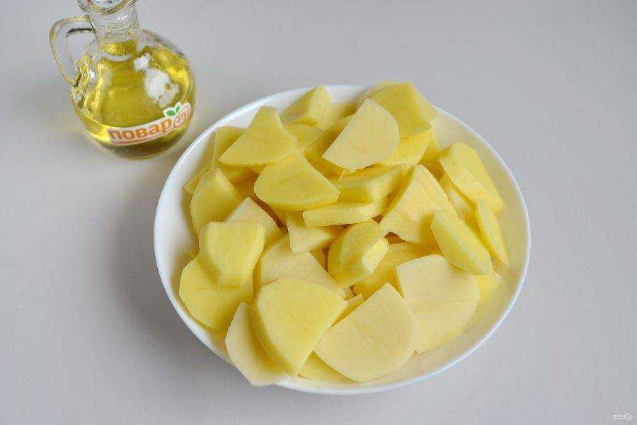 - Очистите картофель, нарежьте некрупными кусками. Посыпьте солью и приправами. Перемешайте.