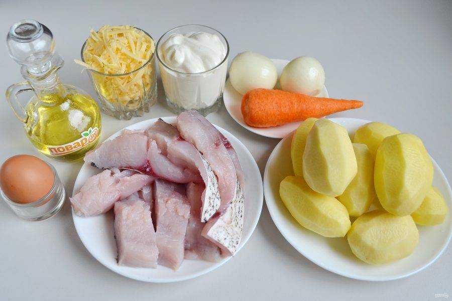 Полноценное рыбное блюдо в духовке с картошкой получается сытным, пряным и очень вкусным. Для готовки требуется 1 кг рыбы, картофеля 6–7 шт., большая луковица и морковка, майонезный соус – 50 г, по усмотрению – соль и порошковые черный перец.