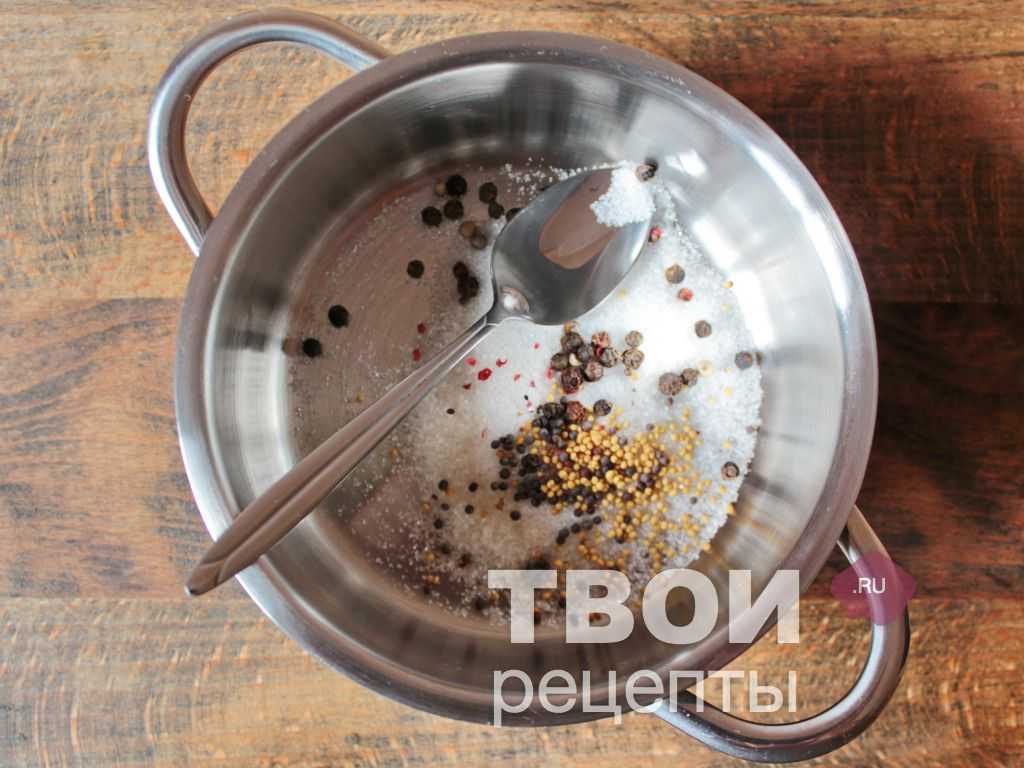Для маринада смешать соль, сахар, душистый перец горошком, зерна желтой и красной горчицы, влить стакан воды и прокипятить, пока не хорошо не растворятся кристаллы.