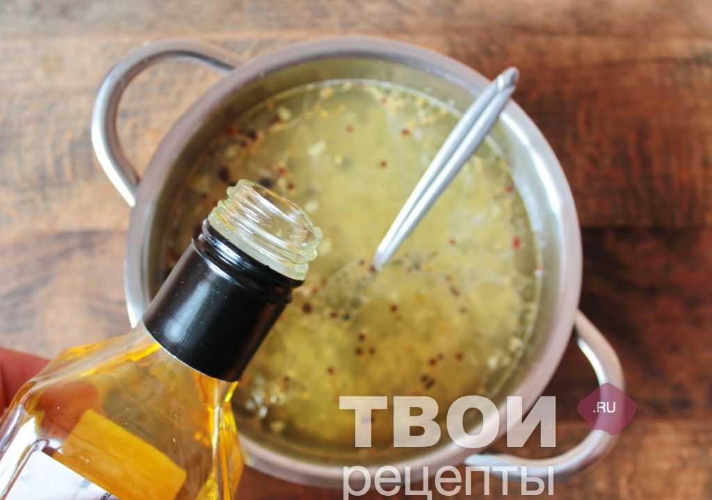 Добавить в маринад рубленный свежий чеснок, уксус и ароматное подсолнечное масло, довести маринад снова до кипения и тут же убрать с плиты.
