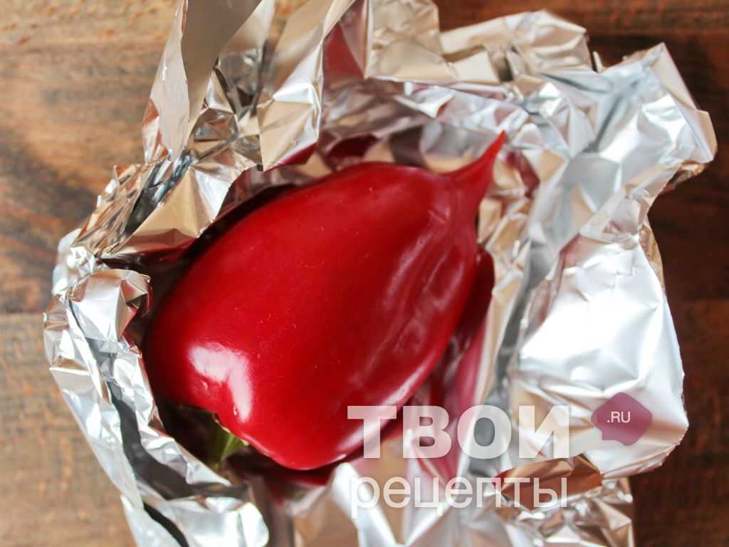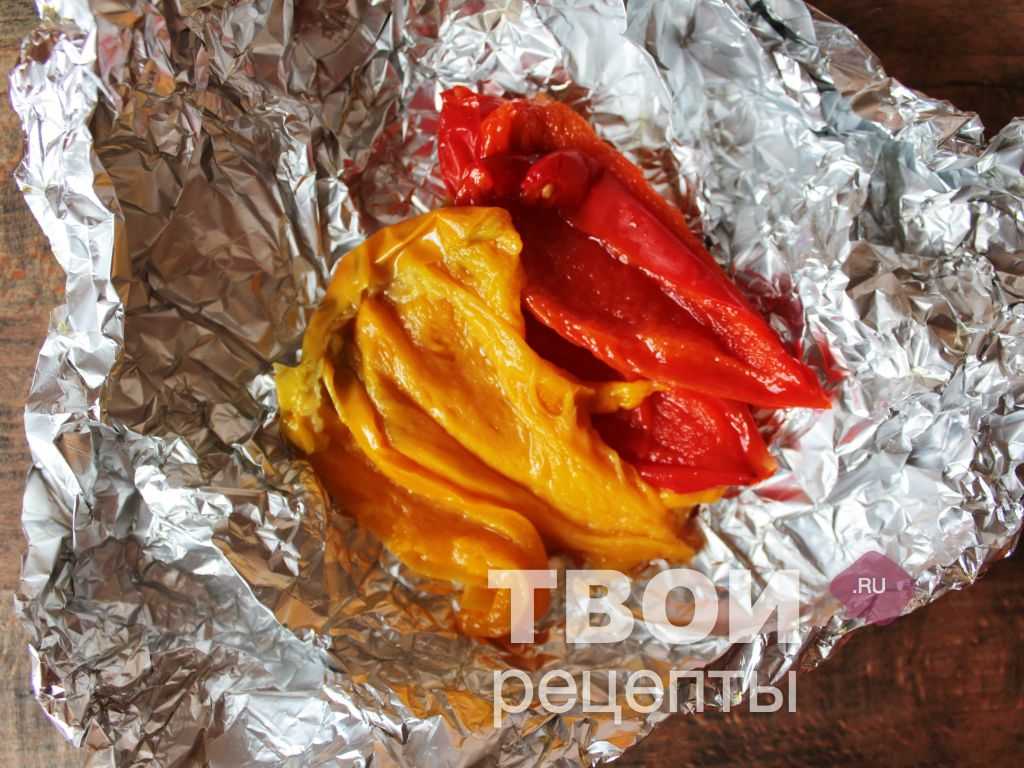 Болгарский перец помыть, обсушить, каждый укутать в фольгу и запечь при максимальной температуре в течение 30-35 минут.