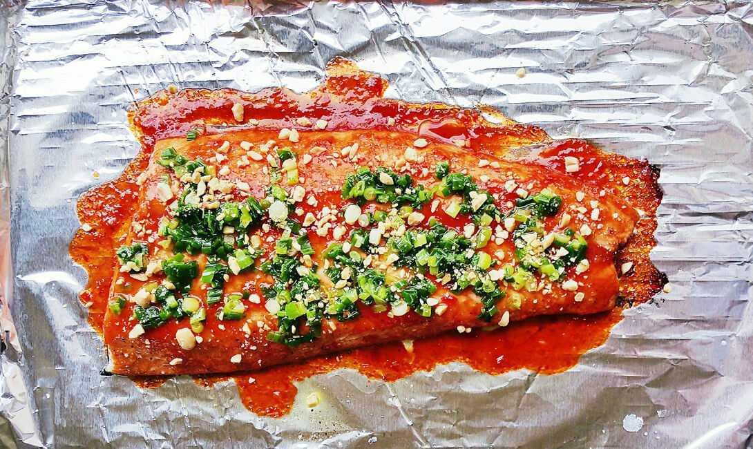 – 6 филейных кусков лосося; – полстакана тайского соуса Чили (легко отыскать в крупных торговых сетях типа Ашана); – 2 столовые ложки тайского соуса Чили (эти две ложки нужны отдельно); – соль; – 2-3 столовые ложки нарезанного зеленого лука.