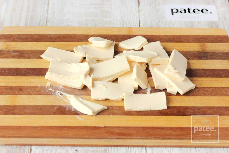 - Плавленый сыр нарезаем тонкими ломтиками. Удобно это делать ножом, смазанным растительным маслом.