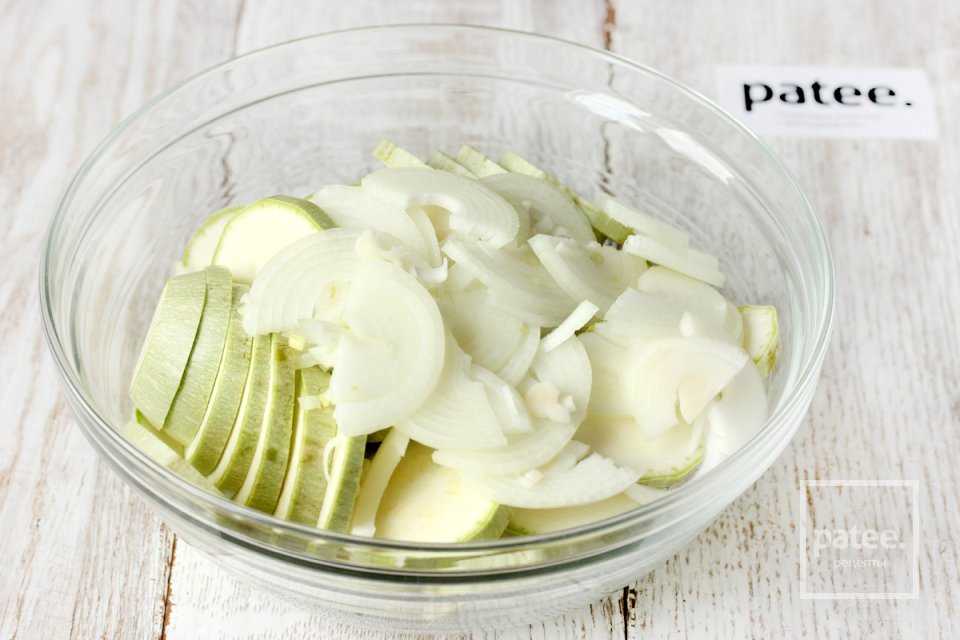 - В глубокую большую миску выкладываем кружочки кабачков. Добавляем к ним нарезанный лук. Также добавляем ломтики сыра.