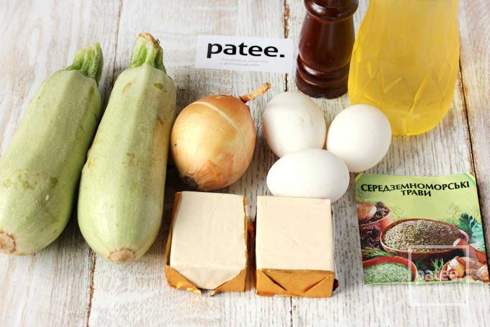Для приготовления этого блюда нам понадобится плавленый сыр, молодые кабачки, куриные яйца, репчатый лук, соль, чёрный молотый перец, подсолнечное рафинированное масло, сухие пряные травы.