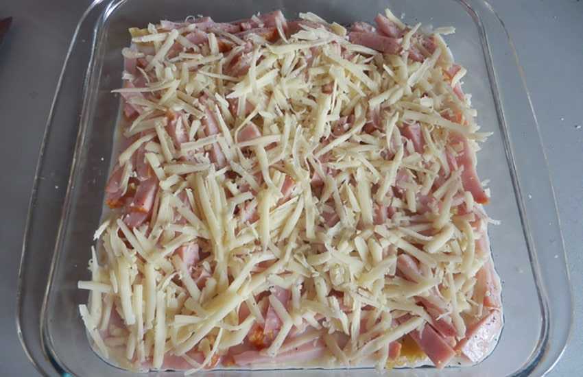 Смесью полейте будущую запеканку, посыпьте сверху натертым сыром.