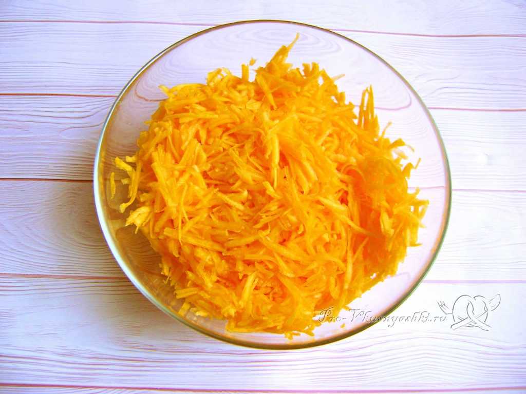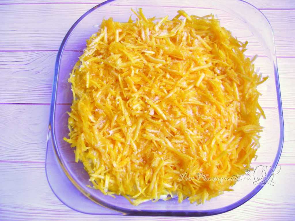 - Тыкву чистим и натираем на крупной терке. Солим и перчим по вкусу.