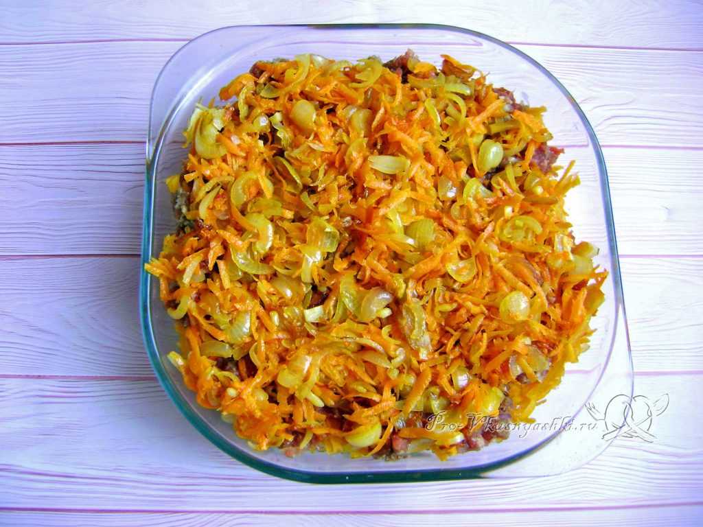 Поверх мяса помещаем обжаренные лук с морковью.