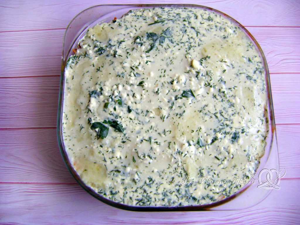 - Перекладываем картофель в форму для запеканки и заливаем его половиной соуса.