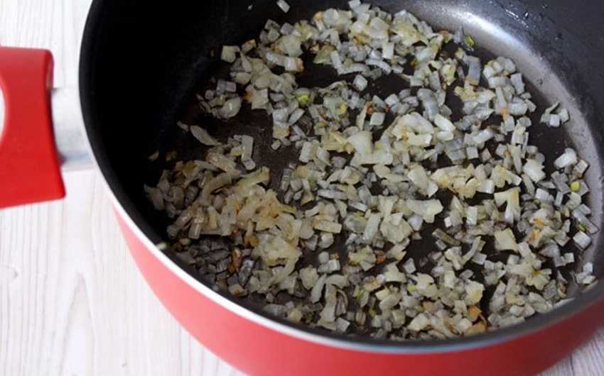 - Луковицу мелко нарежьте и пассеруйте в масле на сковороде до золотистого цвета.