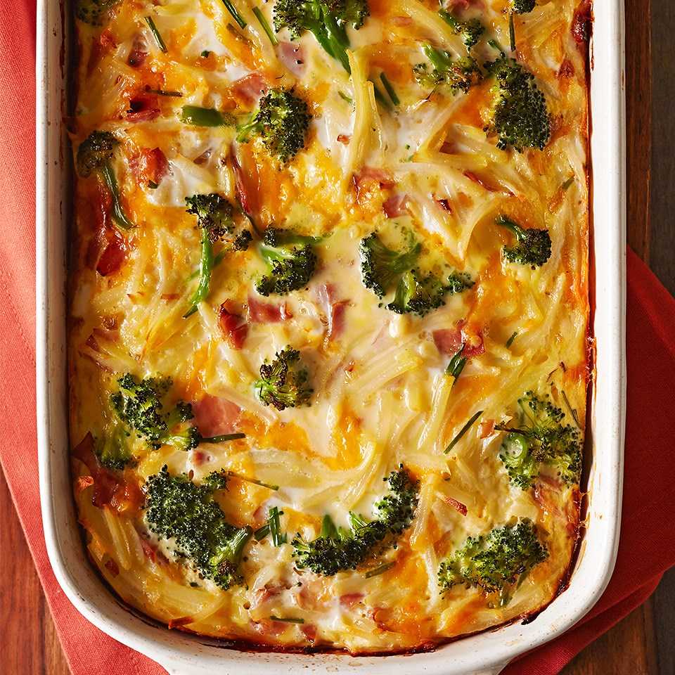 Простая запеканка из замороженной брокколи с яйцом, ветчиной и сыром