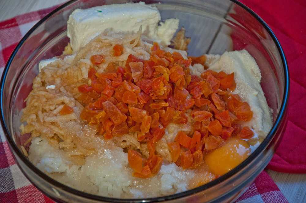 Сладкая запеканка с макаронами и творогом (с фруктами и орехами)