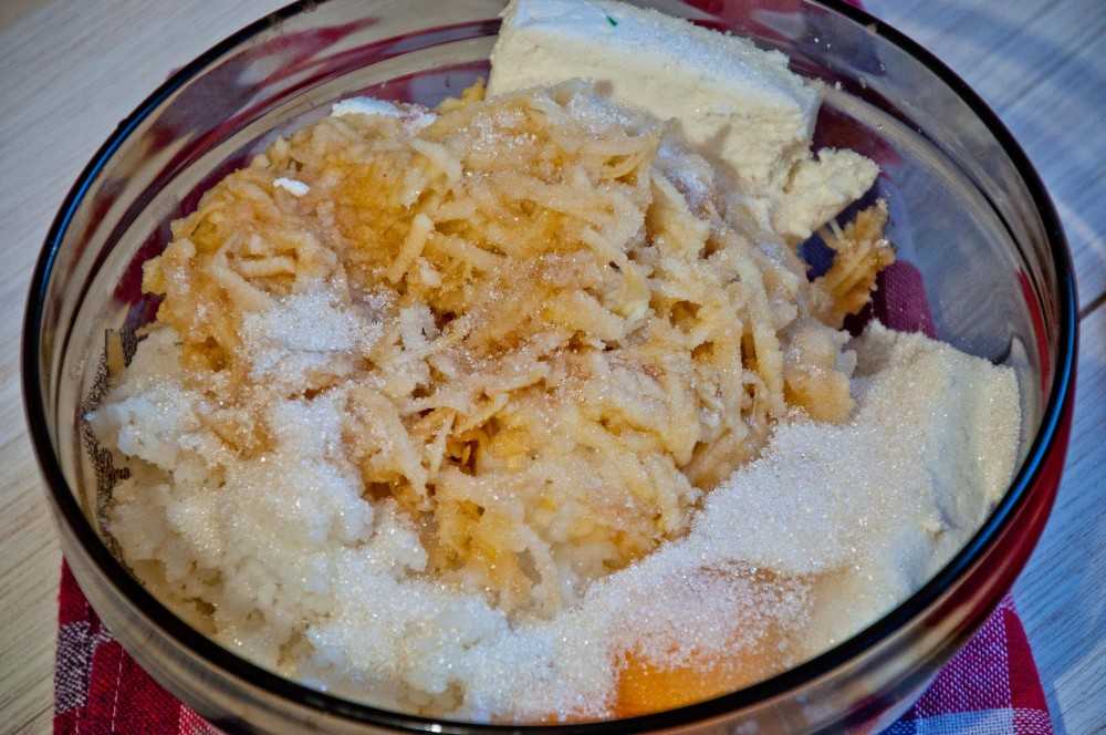 - После этого полученная консистенция вводится в творог и все снова перемешивается.