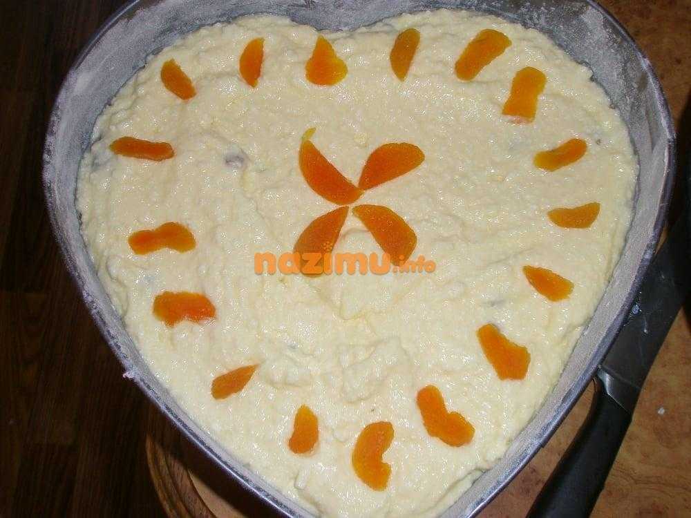 Выложите в форму для выпекания (предварительно смазанную маслом) и украсьте курагой.Включите духовку и разогрейте ее до 180 градусов. Поставьте запекаться кушанье на 50-60 минут. Проверяйте, чтобы лакомство не пригорело. Время готовки зависит от духового шкафа.