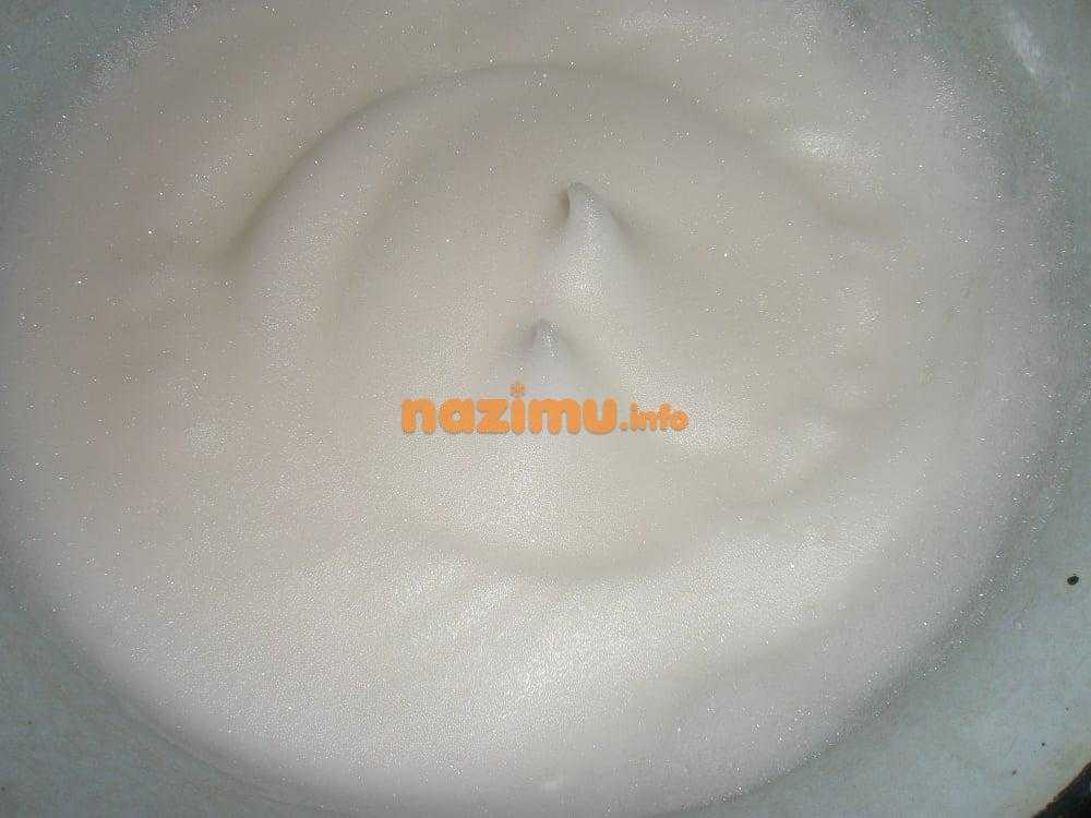 Начнем с яиц. Возьмите куриные яйца и отделите желток от белка. Белки поместите в мисочку и смешайте их с сахарной пудрой. Взбивайте с помощью миксера или венчика. У вас должна получиться однородная масса в виде пены, как на фото.