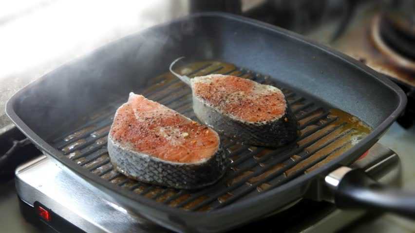 Гриль-сковорода очень популярна для готовки данного блюда. Газовые плиты приспособлены для приготовление в этом изделии. Такая сковорода напоминает поддон, в котором видно отверстие для пламени. Вставляется решетка и дополняется крышкой. Отличная идея для удаления жирового потока из основной емкости в поддон. Это обеспечивает защиту от вредных продуктов во время жарки, они не будут поступать в блюдо.