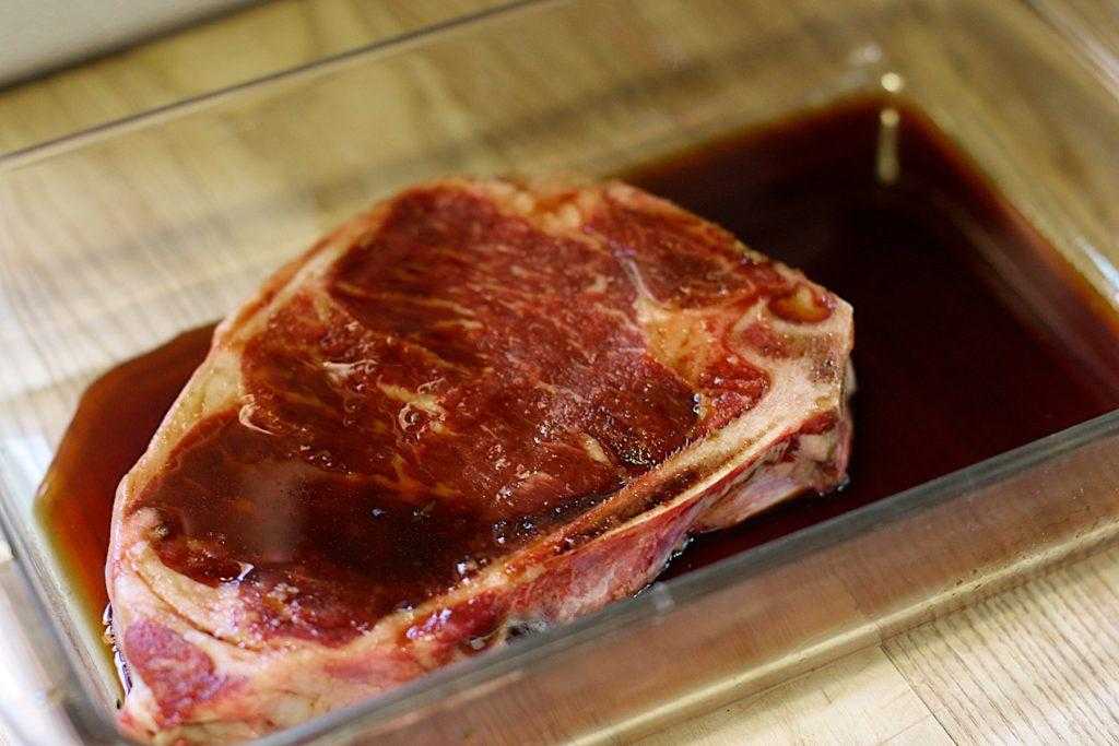 Чаще всего для маринада используются специи или соевый соус. Последний вариант позволит приготовить мясо с полноценным и интересным вкусом. Дополнительный плюс заключается в том, что в таком случае не потребуется использовать другие специи. Стейк Рибай поливают соусом, а затем помещают в холодильник, где он будет мариноваться 2-3 часа. Этого более чем достаточно для приобретения интересного вкуса и размягчения мясных волокон.