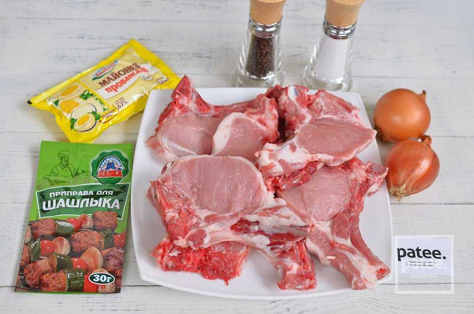 Для приготовления шашлыка нам потребуется: антрекот на косточке (свинина), лук, майонез, соль, черный молотый перец и приправа для шашлыка.