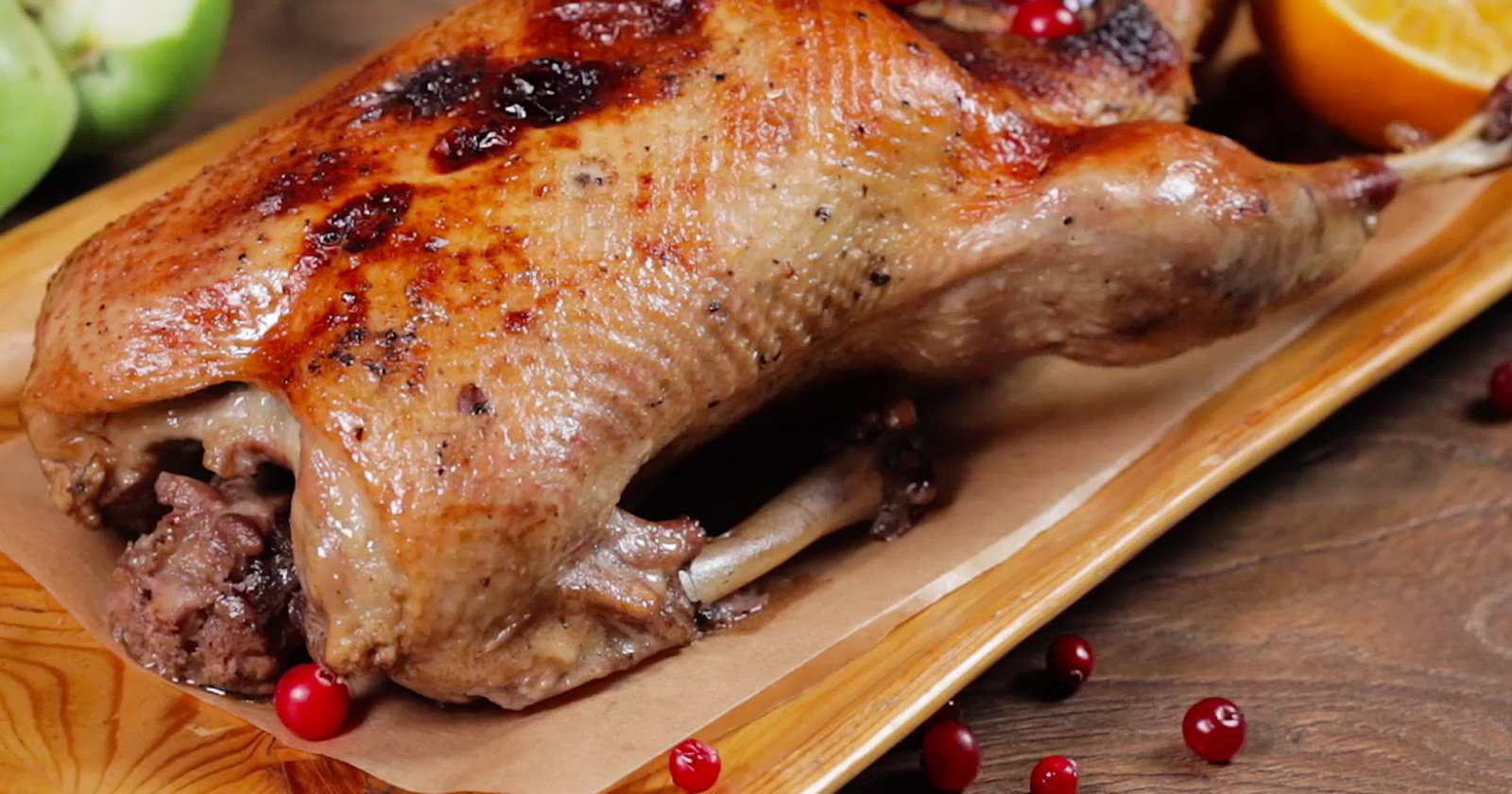 О готовности блюда можно судить по температуре внутри мяса – она должна достичь 80°С в районе бедра.