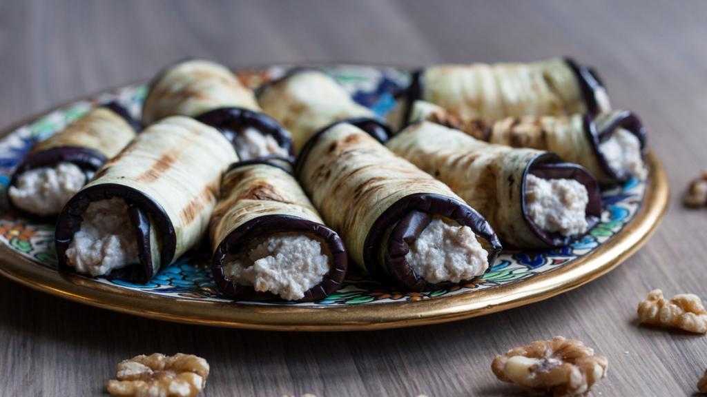 Вымытые баклажаны нарезают продольными полосками и обжаривают в смазанной маслом прогретой сковороде. Подрумяненные синенькие наполняют смесью рубленых орехов, толченого чеснока, уксуса, соли и специй и сворачивают рулетами. Если начинка получилась слишком густой, в нее рекомендуется добавить немного кипяченой воды.