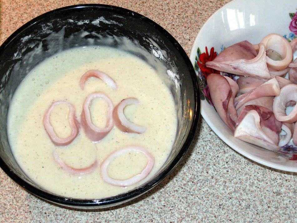 На следующем этапе из яиц, муки и минеральной воды готовым жидкий кляр. Далее, достаем кольца кальмара из маринада, хорошенечко просушиваем их еще раз, а затем закладываем в кляр