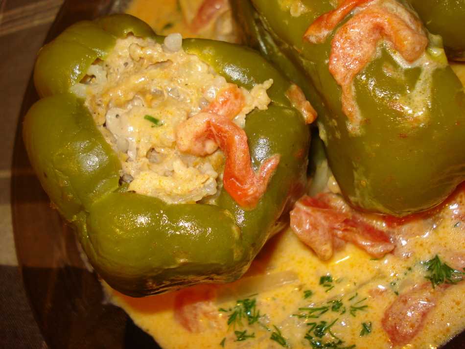 Перец с фаршем и рисом в соусе из сметаны и томатной пасты