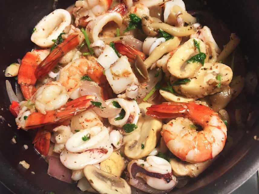 Рецепт креветок и кальмаров с грибами и луком в белом вине