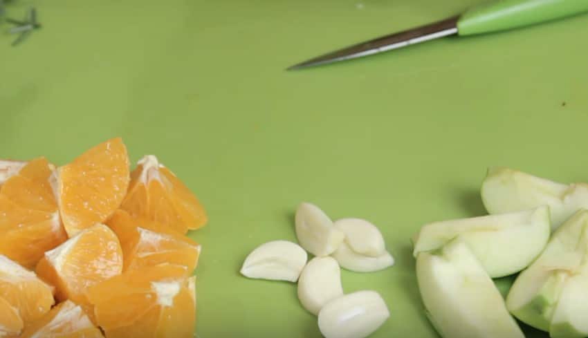 Разогреваем духовку до 180 градусов. На центральный уровень ставим решетку. Под ним размещаем противень. Вынимаем утку из холодильника, помещаем внутрь апельсин, разрезанный на 4 части.